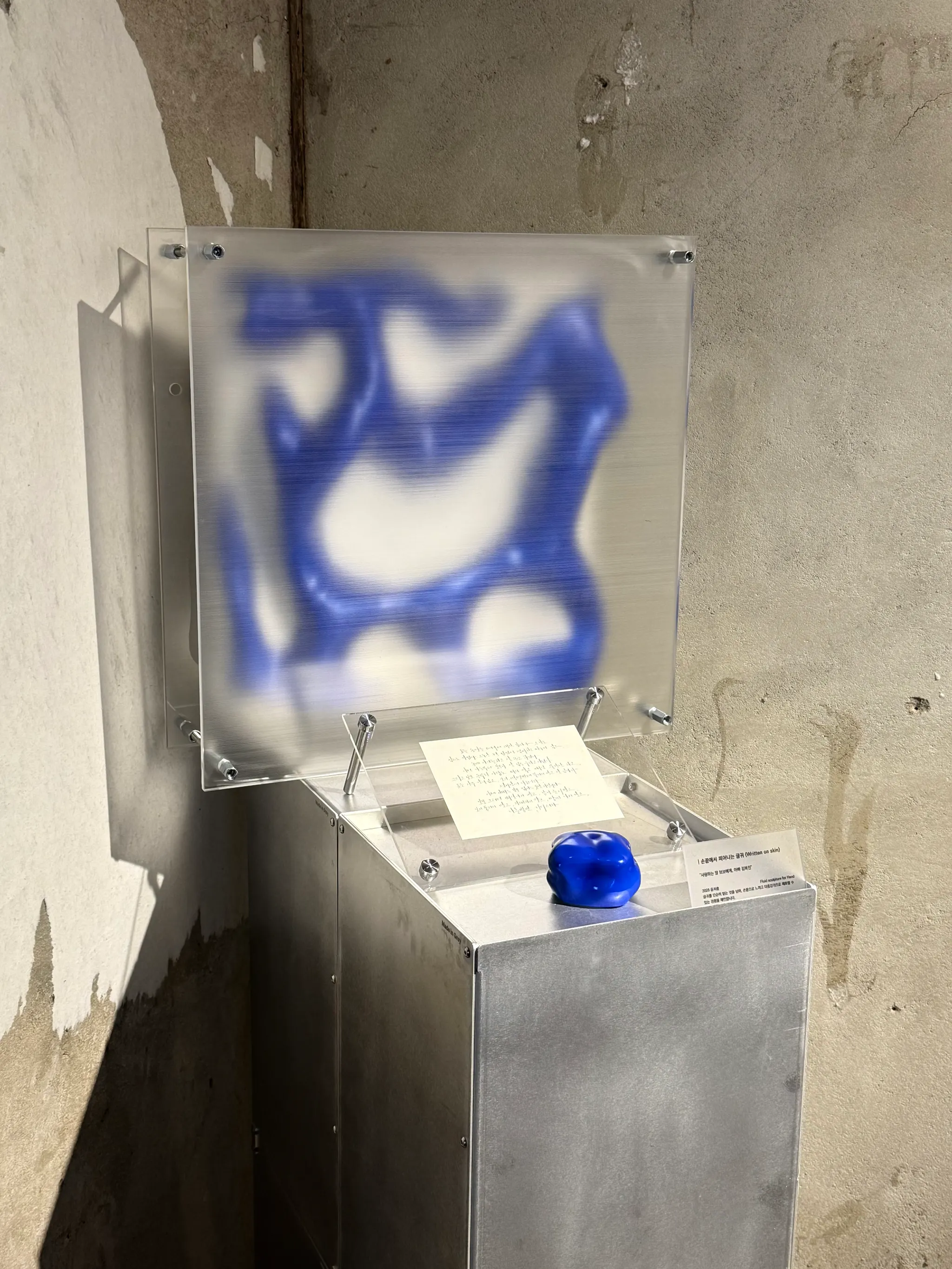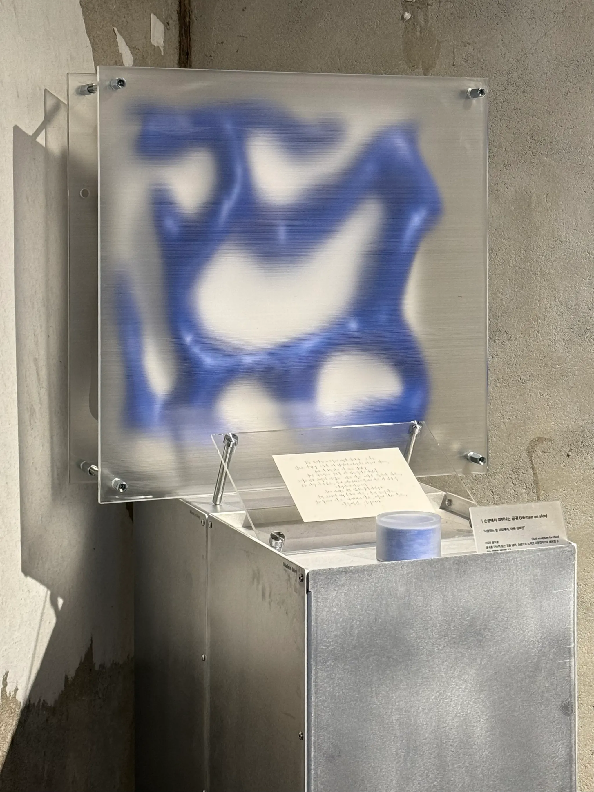 촉각을 통해 감정과 의미를 전달하는 유체 조형은 글귀와 감각이 어떻게 어우러질 수 있는지 탐구하는 작업입니다. 유연하고 끊임없이 흐르는 유체는 언어와 의미의 가변성을 상징하며, 그 움직임 속에서 글귀는 시각적, 촉각적 형태로 피어납니다. 이 과정은 마치 피부에 글귀가 새겨지고, 손끝에서 이야기가 시작되는 듯한 감각을 불러일으킵니다.
